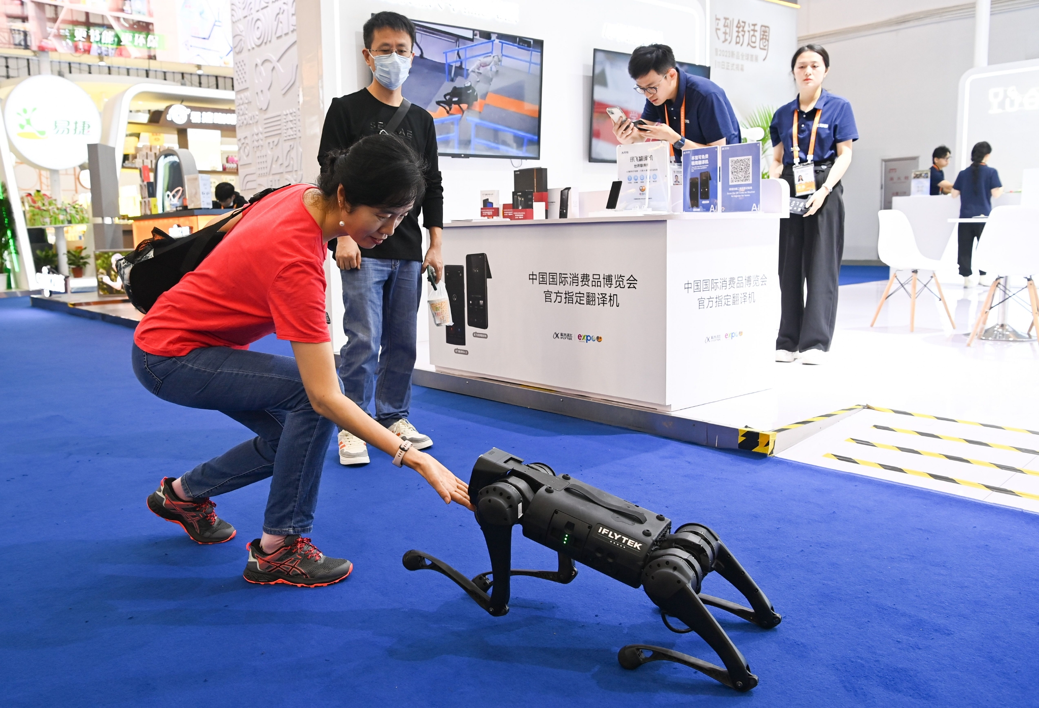 4月13日,第三届消博会上,观众同科大讯飞展出的机器狗互动。新华社记者杨冠宇 摄