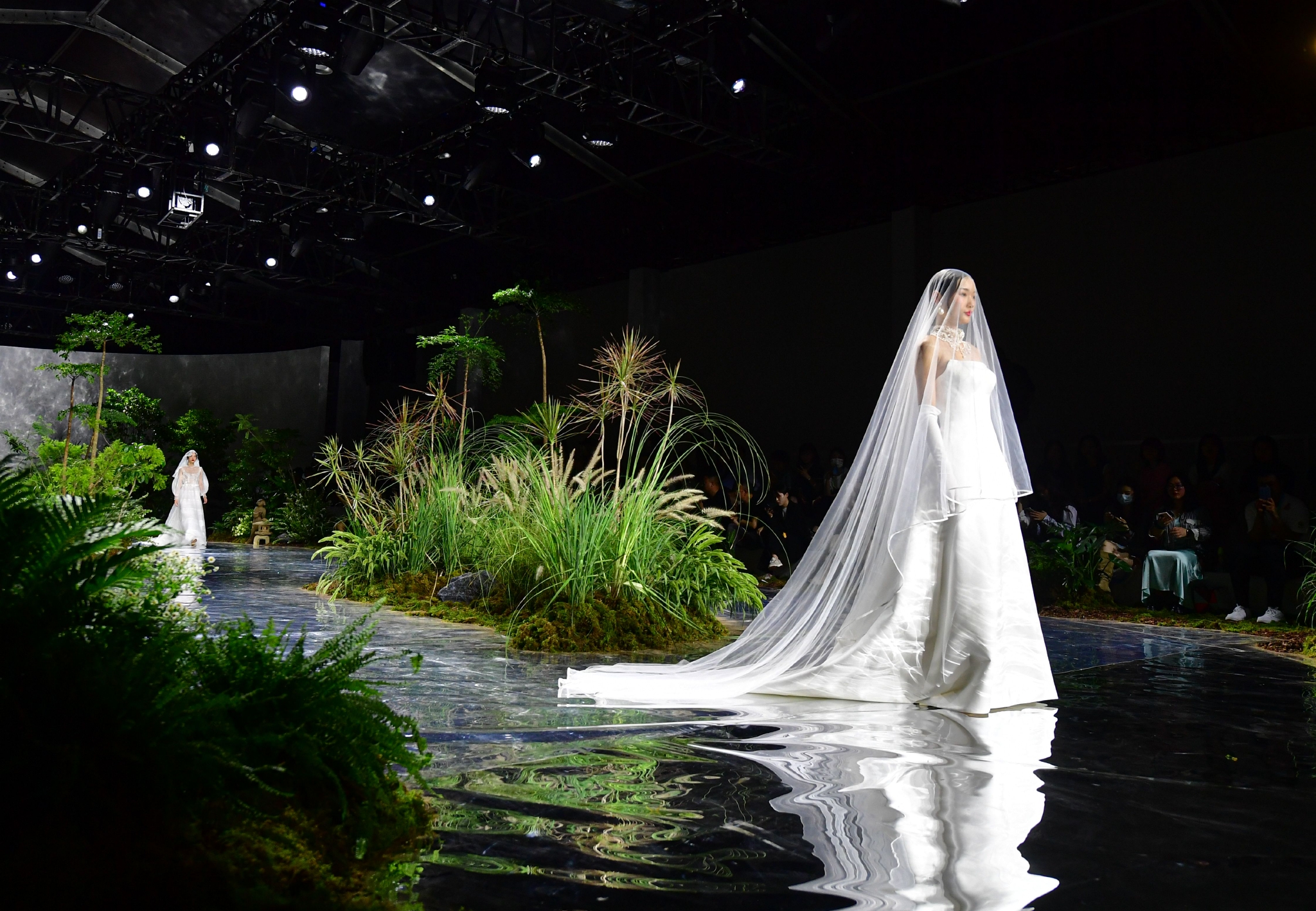 4月14日,模特在第三届消博会时装周主秀场展示时装作品。新华社记者蒲晓旭 摄